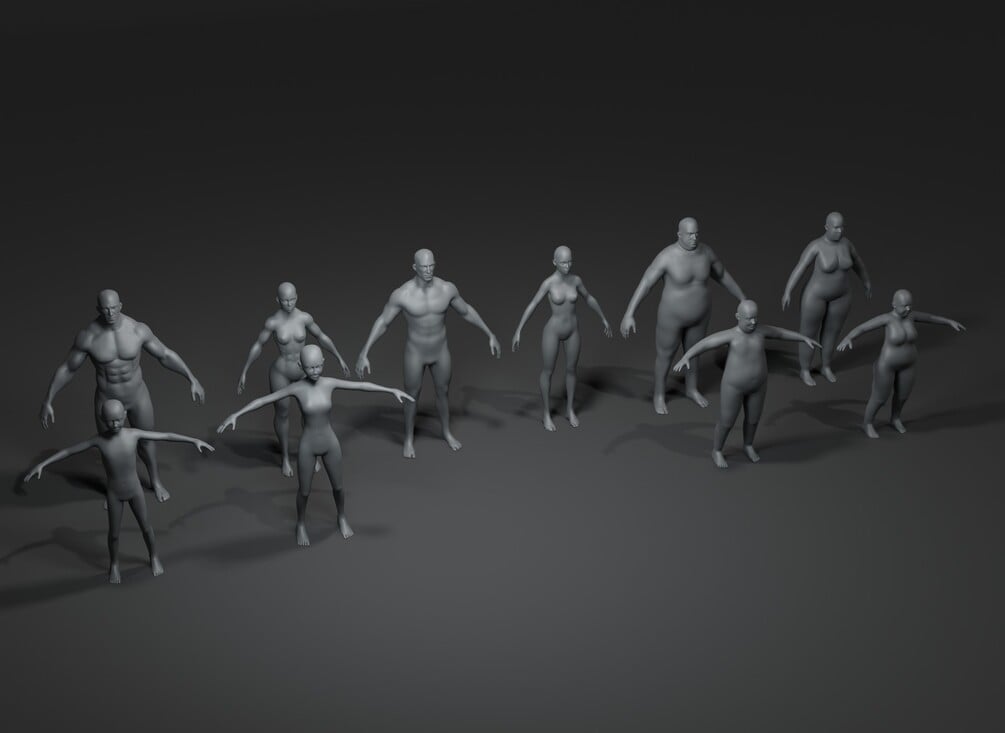Human Body Base Mesh 40 3D Models Pack consists of 40 human base mesh models, grouped in 4 pack of 10 models each (based on their polycount):