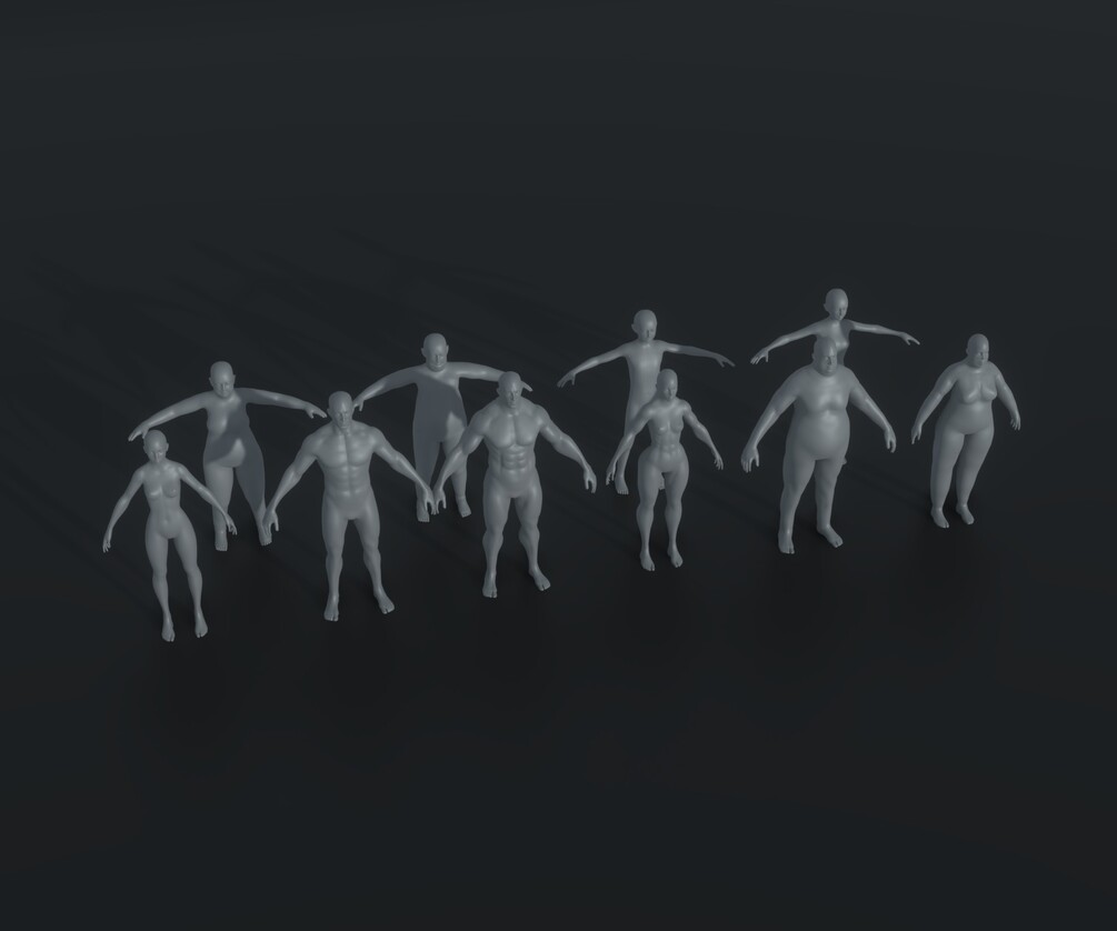 Human Body Base Mesh Animated and Rigged 20k Polygons 10 3D Models Pack consists of 10 base mesh models: